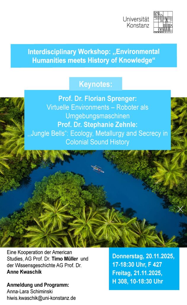 The event features two hybrid keynote lectures open to everyone: Prof. Dr. Florian Sprenger on “Virtuelle Environments – Roboter als Umgebungsmaschinen” and Prof. Dr. Stephanie Zehnle on “‘Jungle Bells’: Ecology, Metallurgy and Secrecy in Colonial Sound History.”